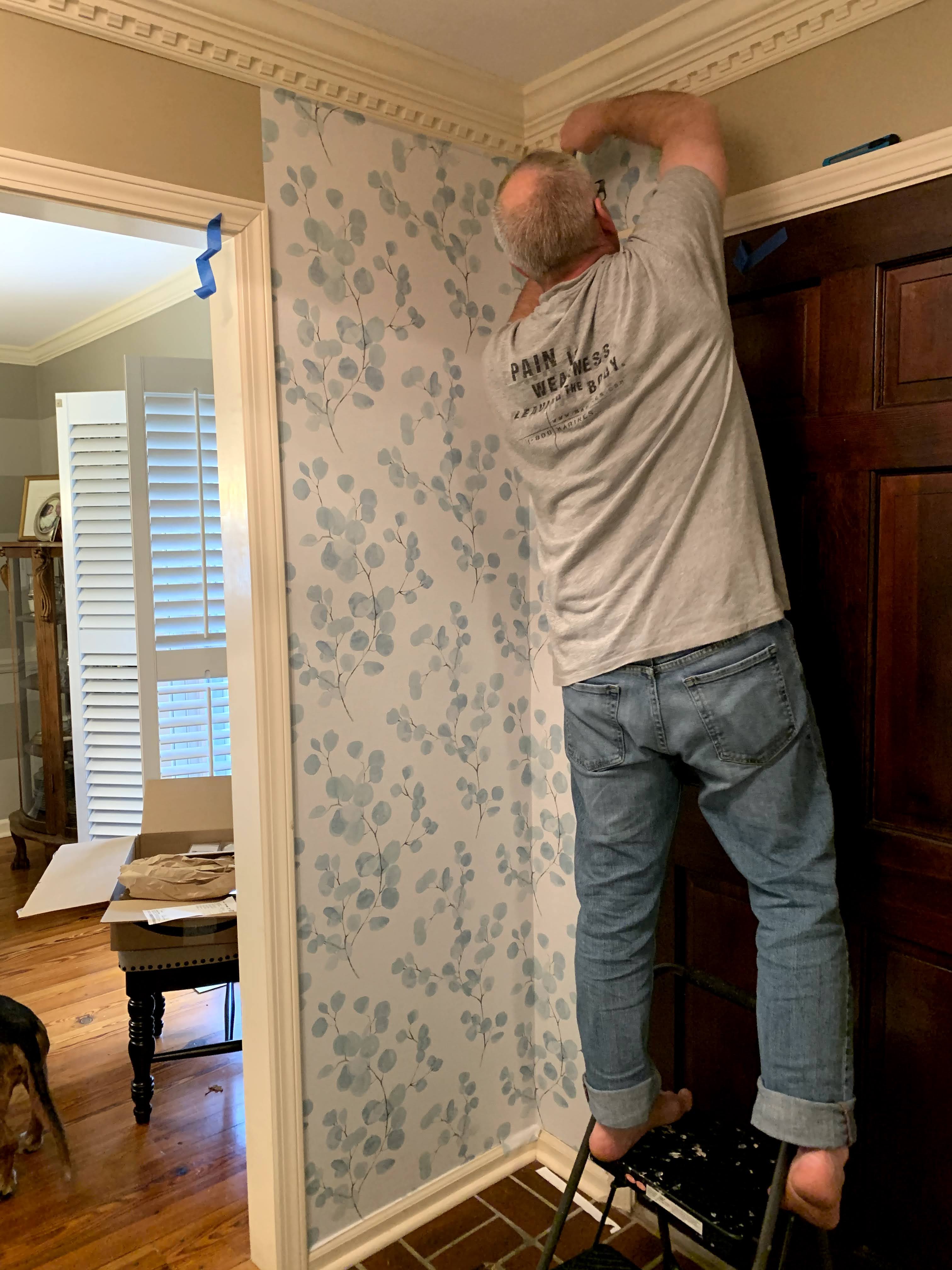 We got those rolls home and y’all, I was ready to start peeling and sticking! I thought this was going to be easy-peasy-lemon-squeezy. I was wrong. The wallpaper was trickier to put up than I thought it would be and required a lot of precision. A lot. I am not a precise person. I lose patience and want to just get everything finished. My husband watched me do it for maybe 30 minutes and was twitching (he is very precise). He stepped in to make sure things ran smoothly š
